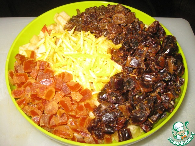 Курагу и финики нарезать кубиком, добавить к яблокам.