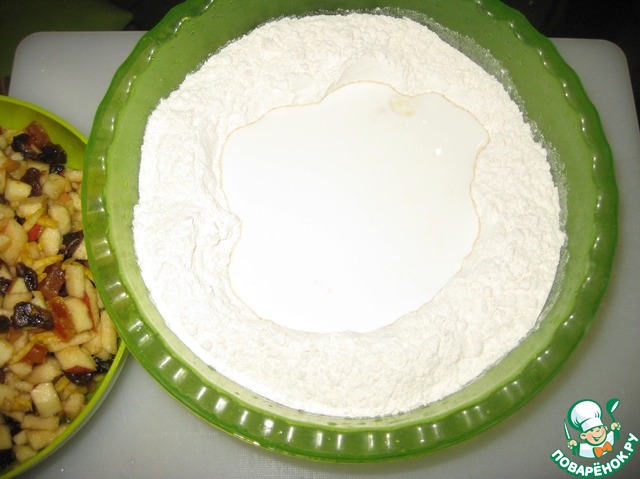 Далее готовим тесто. В блинную муку нальём кефир (я люблю пожирнее) и замесим мягкое тесто. Всё.