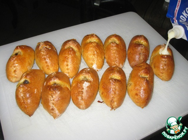 В ещё горячие расстегайчики потихонечку тоненькой струйкой наливаем сгущёнку. Этот шаг можно и пропустить, но с ним намного сказочнее.