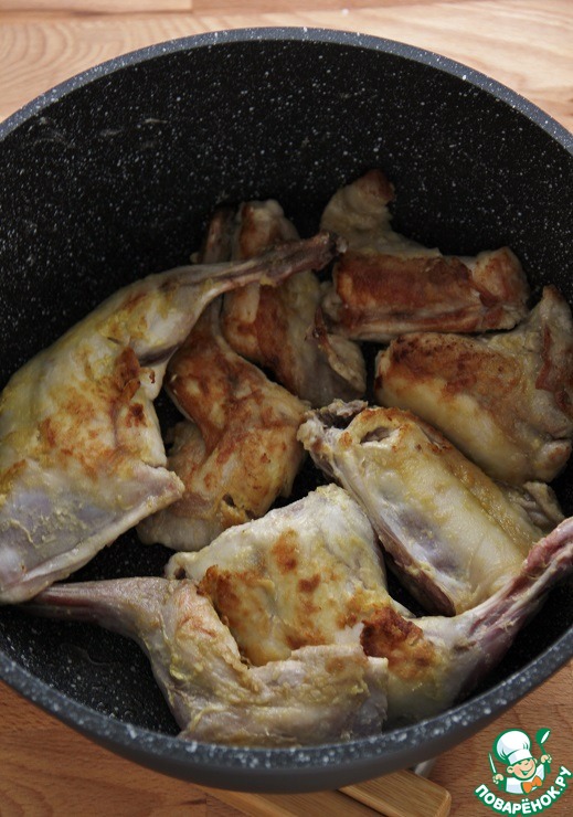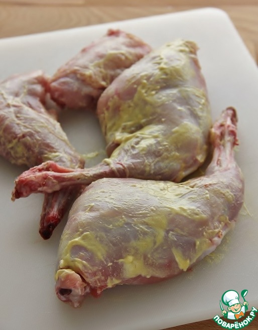 Кролика разрезать на куски, смазать горчицой (2ст. л). Оставить на 30мин.