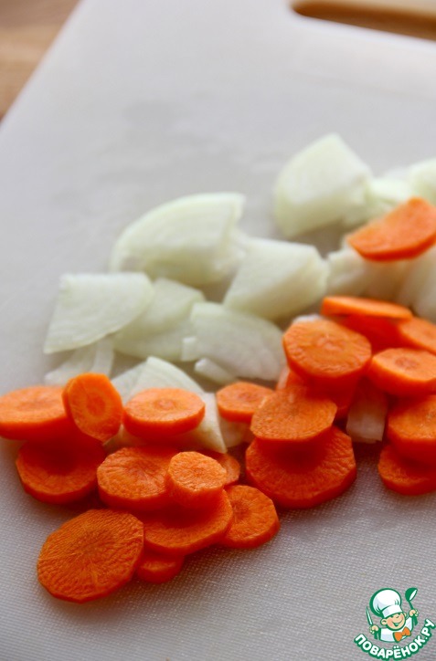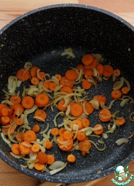 В этой же кастрюле обжарить лук, мелко нарезанный чеснок и морковь до золотистого цвета.