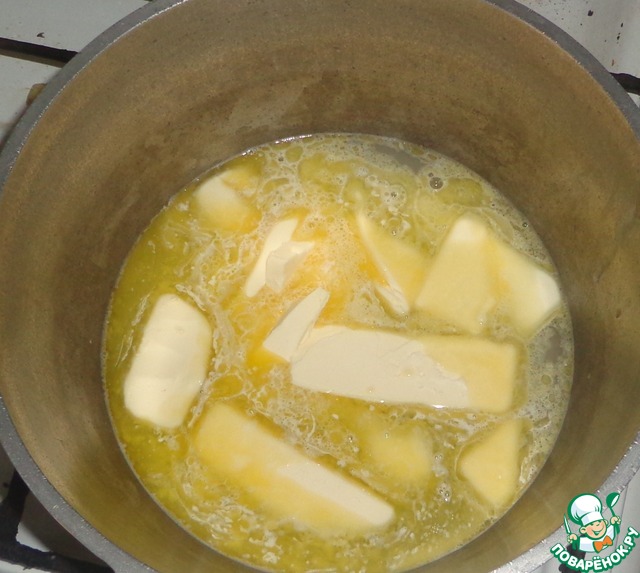 Соединить воду, щепотку соли и сливочное масло. Поставить на медленный огонь.