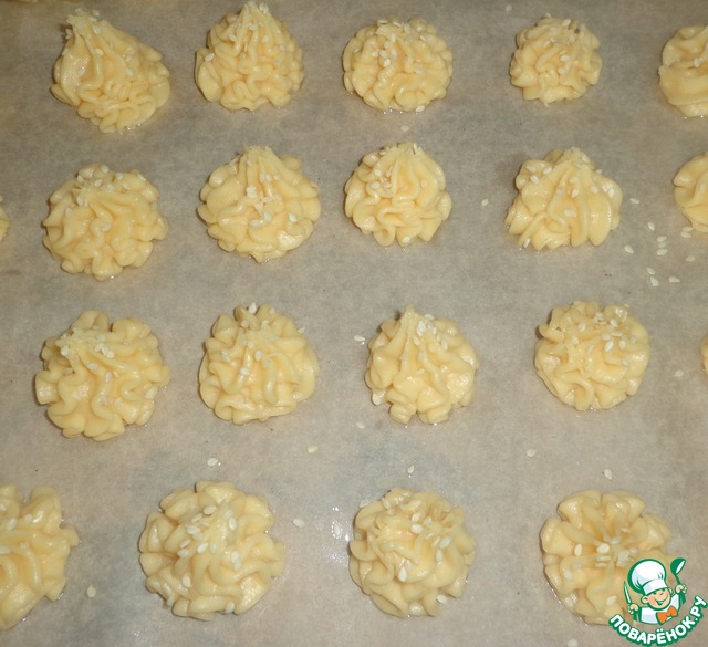 Выкладываем на противень тесто в виде профитролей. Посыпать кунжутом.