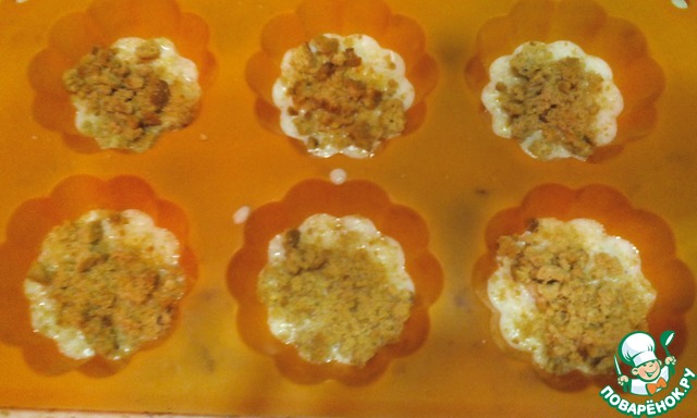 Печенье можно поломать, а можно оставить целым, если в формочки вмещается (Как я уже поняла - на мой взгляд лучше целым оставить, чтобы оно не размокло, а похрустывало как сюрприз)