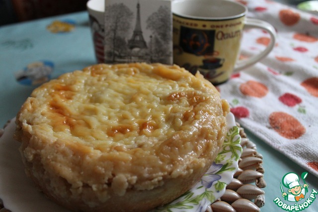 Сверху всё залить кремом. Поставить в разогретую до 180ºС духовку и выпекать 60 мин. Моя духовка плохо румянит, возможно в Вашей духовке шарлотка приготовится быстрее. Я проверяла готовность по консистенции крема: достала когда крем стал абсолютно густым. Думаю, можно попробовать сделать с немного жидким кремом (предполагаю, что он всё равно застынет при остывании), чтоб было нежнее.