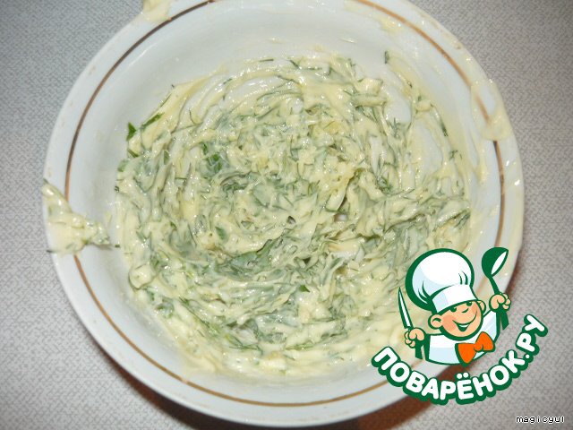 Размягченное сливочное масло соединить с мелко нарезанной зеленью,чесноком и солью