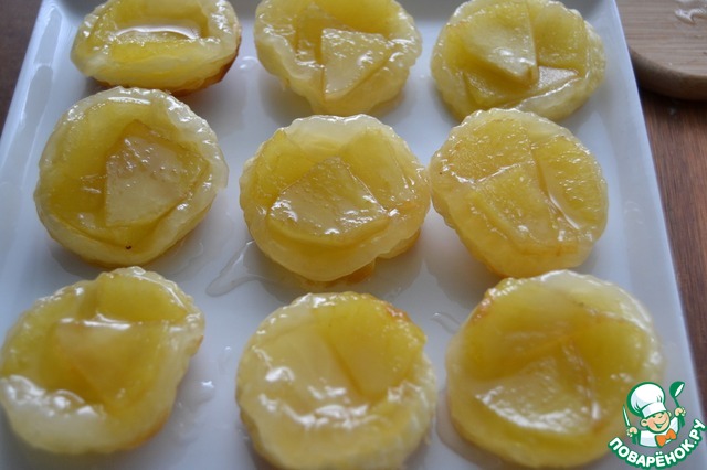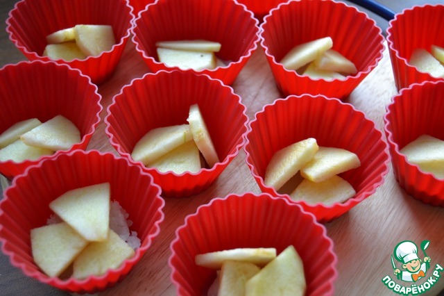 В формочки для маффинов на дно идет сироп, а потом кусочки яблока.