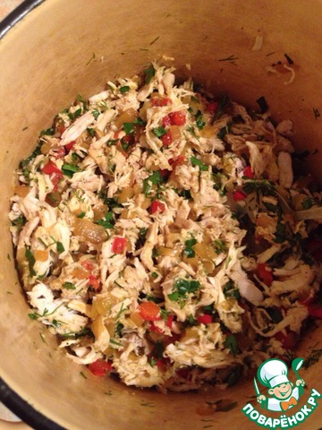 Отвариваем куриную грудку, туда же добавляем специи, что бы грудка получилась ароматная. Пока куриная грудка варится, нарезаем мелко перец, лук, чеснок и ставим жарить на мелкий огонь на 6 минут.