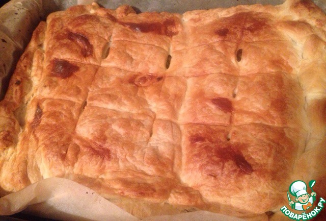 Слоеное тесто. Я из двух пластин скатала в одно, тонко не раскатываем. На противень кладем пекарскую бумагу, смазываем маслом. Выкладываем туда лист слоеного теста, кладём начинку. Сверху застилаем другим листом теста, края защипываем. Смазываем сверху чуть чуть молочком, чтобы тесто получилось пышное.