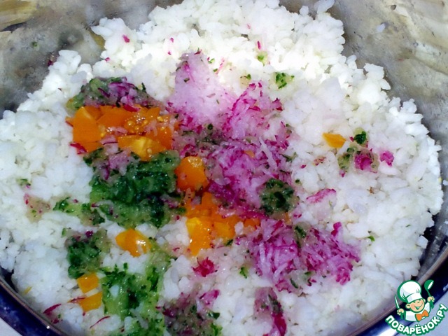 В рис натёрла редис, огурец и нарезала помельче помидоры.