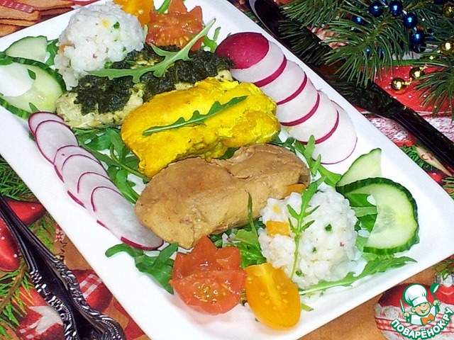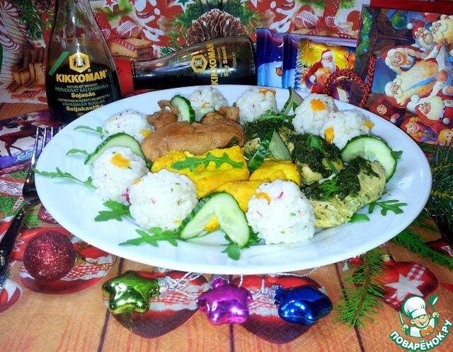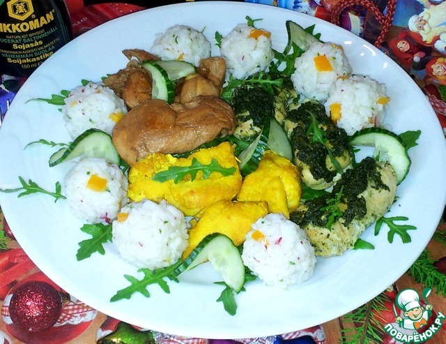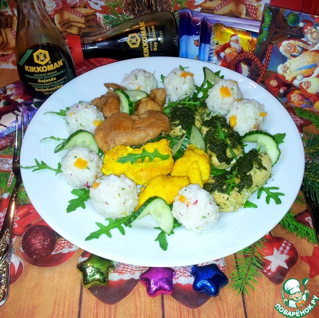 | Рецепт для любителей курочки. Это блюдо украсит Новогодний стол. И я уверена, что гостям понравится. Блюдо можно украсить более ярко на свой вкус. Можно подать его холодным с горячим белым соусом. Я пока репетирую и делюсь с вами. На праздничном столе это блюдо будет самым ярким и популярным у гостей. |