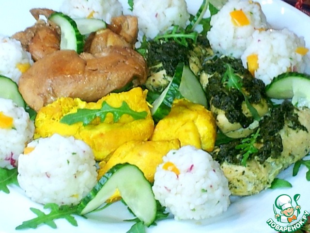 А вечером куриные брусочки разложила по отдельности (каждый цвет) в фольгу.