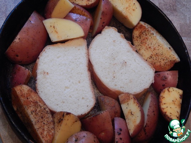 На дно формы кладу два куска хлеба (на которые положим курицу), а по бокам выкладываю картофель. Дно смазываю оливковым маслом