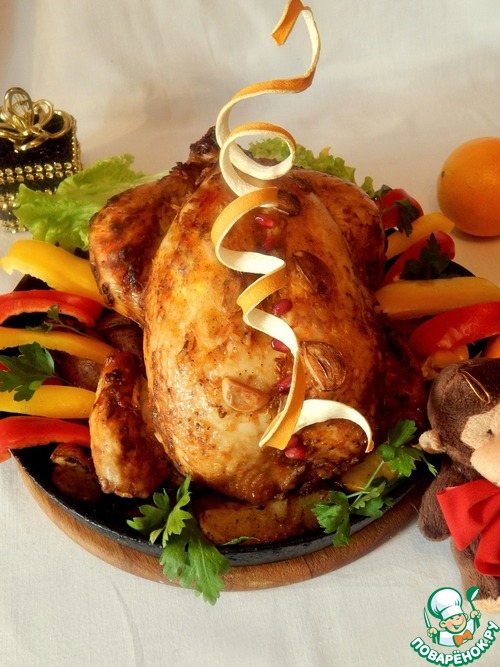 | Вы любите фаршированную птицу? я очень! Особенно я люблю курицу с рисом... поэтому с удовольствием хочу поделиться с вами рецептом приготовления, который понравиться и нам и весёлой обезьянке-ведь в нём мы уделим ей большое внимание а так же приготовим для неё сюрприз! Думаю что отведав курицу с "сюрпризом" Обезьянка с радостью прочно поселиться за вашим столом и принесёт в ваш дом радость и тепло! Разогреть духовку. Противень смазать оливковым маслом. Картошку почистить, нарезать и выложить на противень. Налить воды на 1/3 глубины противня. Курицу, ножки и бёдрышки вымыть, высушить (обтереть) и просыпать специями и солью, помассировать. Майонез перемешать со специями, ягодами можжевельника и перцем, нанести тонким слоем на курицу. Выложить курицу на противень поверх картофеля. Внутрь курицы поместить очищенный апельсин. Сверху положить тёртый чеснок. Накрыть фольгой и запекать при 200 градусах 1,5-2 часа. |