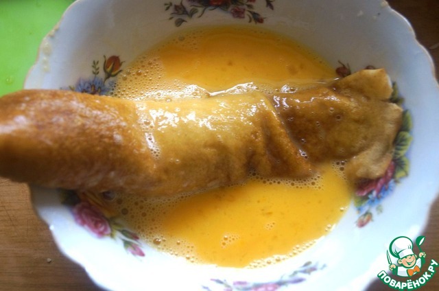 Сворачиваем рулетиком и обмакиваем блинчик во взбитые яйца