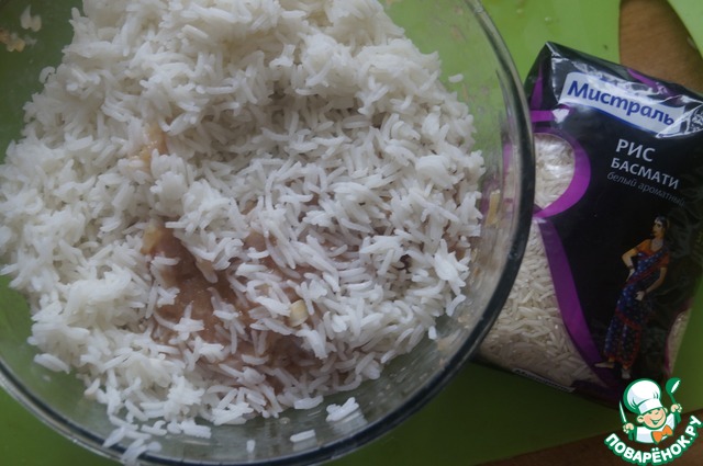 Рис отвариваем в воде почти до готовности. Откидываем на сито, даем воде стечь и немного остужаем рис. Добавляем его в фарш и перемешиваем. Убираем фарш в холодильник, накрыв пищевой пленкой.