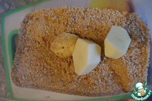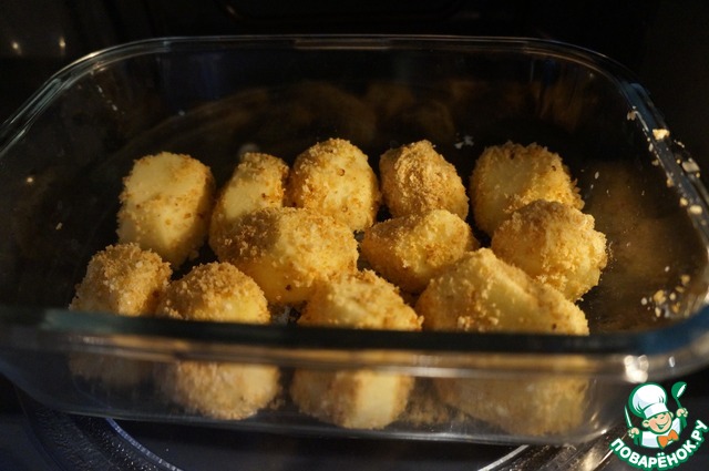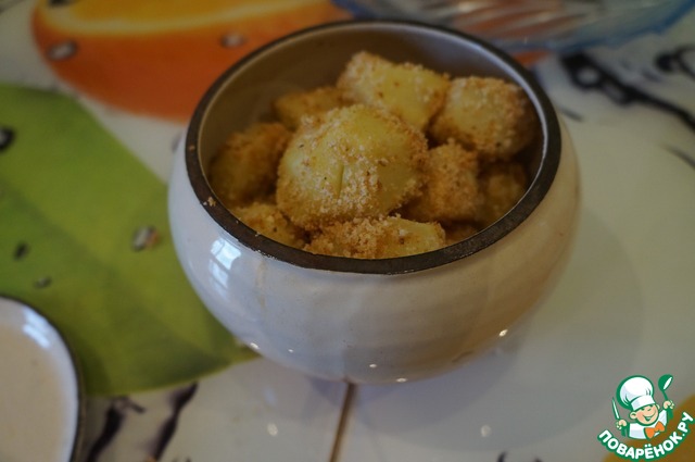 Берем планировочные сухари и начинаем валять в них картошку. Если у Вас крупная картошка разрежьте ее пополам.