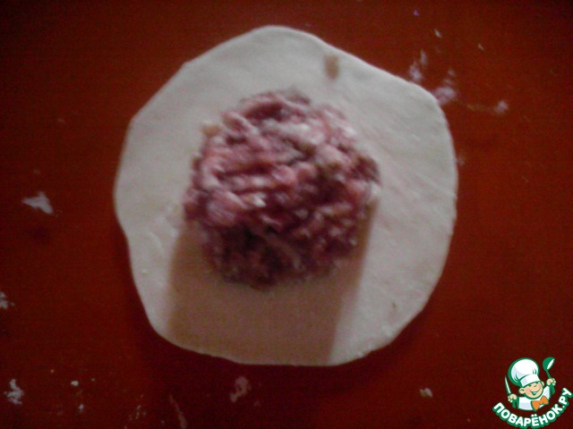 Скатать шарик из теста размером с грецкий орех, раскатать его скалкой в виде круга толщиной около 2 мм, размер круга примерно с ладонь.