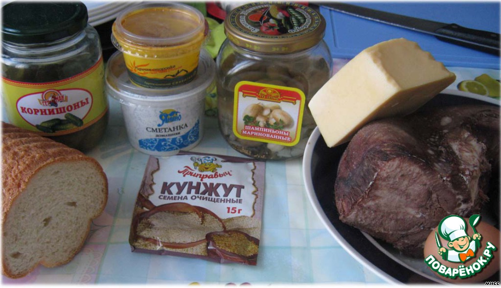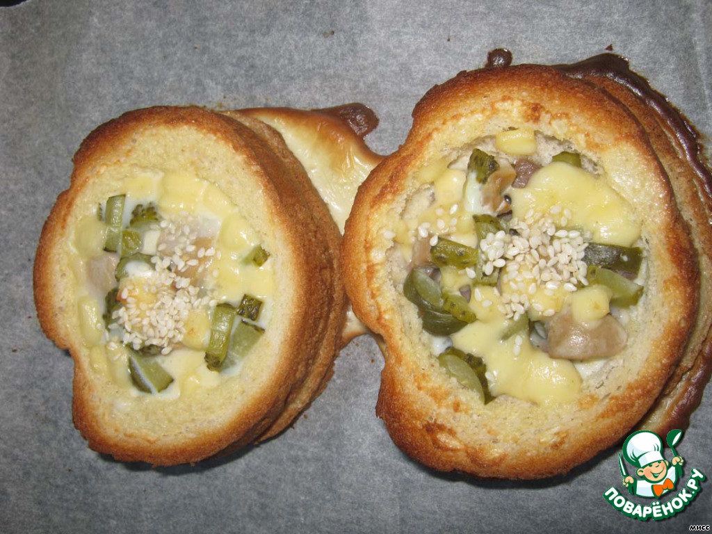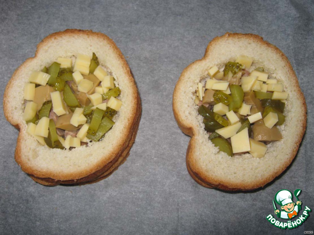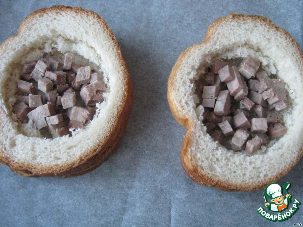 Берём форму, застилаем пергаментом, на него выкладываем хлеб. Кусочками языка заполняем пустоту в хлебе.