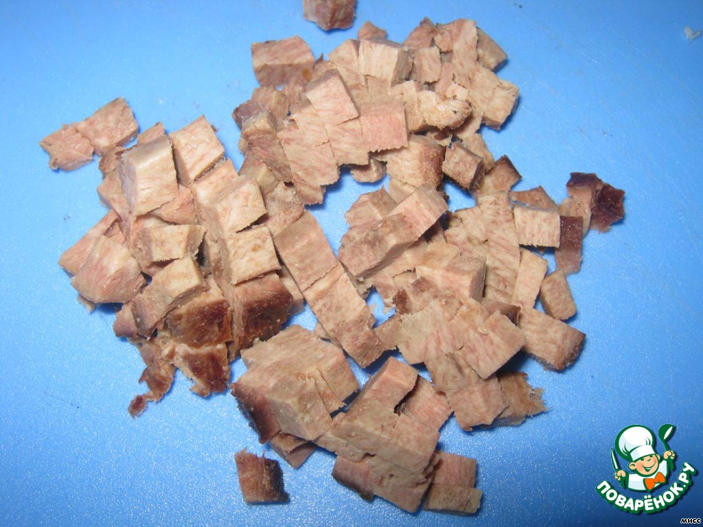 Далее берём любое варёное мясо: свинину, курицу. Можно использовать колбасу, ветчину. Но мои мужики фанаты языка. Он всегда у меня припасён к празднику, его и использую. (Язык сварила в течение 2-2,5 часов в подсоленной воде, затем опустила под проточную холодную воду на 5 минут, сняла шкуру). Язык быстро нарезаю мелко, сама, это нельзя никому доверить, больше съедят, чем нарежут.