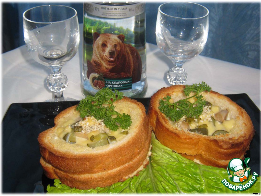 | В нашей семье 23 февраля - большой праздник. Муж отдал нашей армии почти 30 лет, ушeл подполковником в отставку, я сама старший прапорщик на пенсии. Младший сын родился 23 февраля, ему исполняется 20 лет. Поэтому готовиться и готовить придeтся много и заранее. Мне мои "мальчики" всегда помогают. Но начало любого доброго дела не обходится без рюмочки водочки, на то они и мужики. Не подумайте, пожалуйста, что я пропагандирую пьянство и алкоголизм. Ни в коем случае! Но, думаю, рюмочка водки перед таким делом не помешает. А под неe и закуска соответственно. Вот еe я и приготовлю. Ну, а название - тост генерала из любимого фильма мужа "Особенности национальной охоты". |