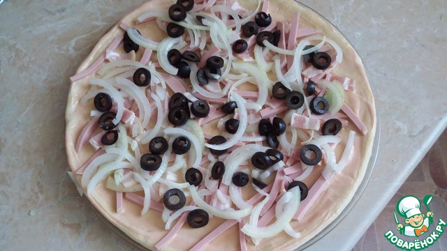 7 Выкладываем слой колбасы, бекона и лук