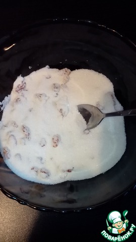 Изюм замочить в горячей воде на несколько минут. Достать, обсушить. Смешать сахар, ванилин, манку, разрыхлитель, изюм.
