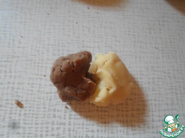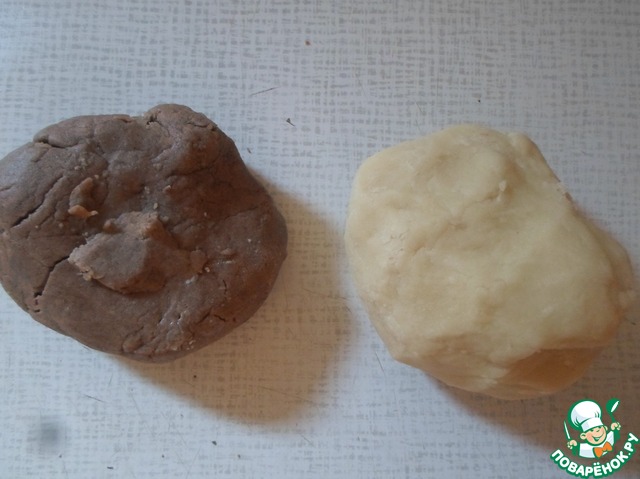 Разделяем массу на 2 части. В одну добавляем какао, другую оставляем без изменений. В каждую часть добавляем муку и замешиваем эластичной и мягкое песочное тесто.