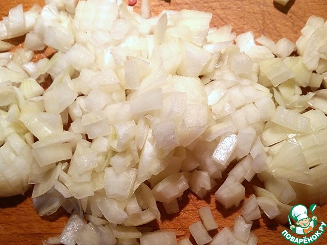 Нарезать лук кубиками. Обжарить до золотистого цвета.