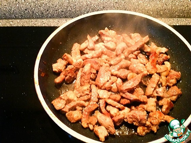 Мясо нарезать не толстой соломкой и тоже обжарить до красивой корочки. Мясо для салата рекомендую выбирать из свинины или говядины, т. к куриное мясо (и мясо птицы вообще) здесь просто неуместно, а мясо, жир которого застывает при охлаждении, по понятным причинам не подойдёт.