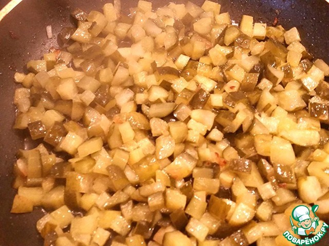 Огурцы нарезаем не сильно мелкими кубиками, т. к при обжаривании они уменьшаться в размере, как грибы. Обжариваем до полного испарения жидкости и появления слегка золотистый корочки. Теперь о выборе огурцов. Используем огурцы с наименьшим содержанием уксуса. В идеале бочковые. Магазинные огурчики в баночках не подойдут. Там ооочень много уксуса. Когда будете перекладывать продукты со сковороды, слегка отжимайте ложкой, чтоб не осталось много масла.