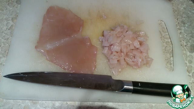 Сперва надо приготовить ингридиенты. Чистим кальмар и нарезаем мелкими кусочками примерно сантиметр на сантиметр.