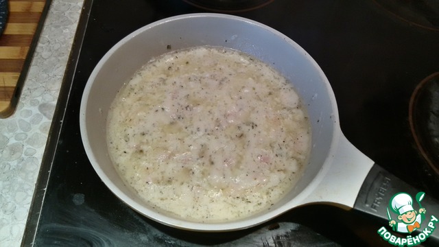 Готовим соус бешамель. Для этого берём небольшую кастрюльку, наливаем туда 2 столовых ложки растительного масла. Да, я в курсе, что обычно используется для этих целей сливочное, но предпочла растительное совершенно сознательно и отнюдь не в целях экономии. Просто во время своих экспериментов обратила внимание, что если использовать растительное, вероятность образования комков, подгорания и прочих трудностей существенно меньше. какого-то отрицательного влияния на вкус блюда я при этом не заметила. В общем ставим кастрюльку с маслом на плиту, нагреваем масло, но не до кипения. Кладём муку и тщательно перемешиваем. Затем маленькими порциями заливаем молоко, при этом каждый раз старательно перемешиваем. Затем кладём соль и приправу. Перемешиваем ещё раз. Даём минутку покипеть, постоянно помешивая. Соус готов.