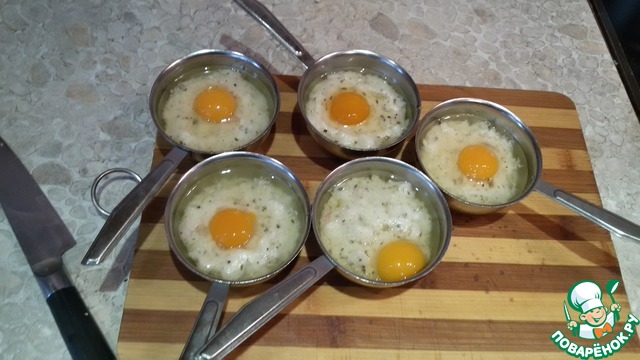 Раскладываем получившуюся массу по жульенницам. У меня вышло 5 штук. Смысл в том, что количество яиц такое же, что и жульенниц.