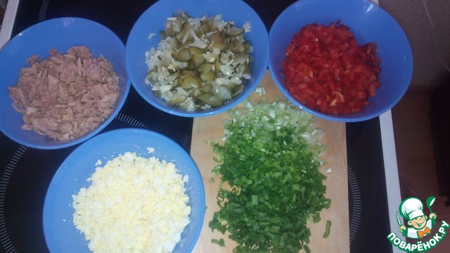 Мелко рубим огурцы, тунец, репчатый лук, болгарский перец, вареные яйца, зеленый лук, чеснок.
