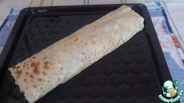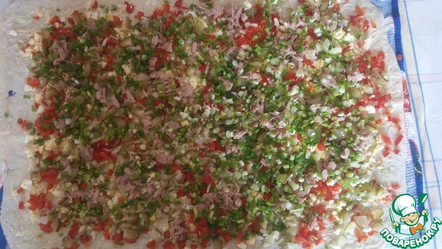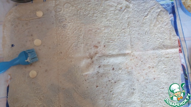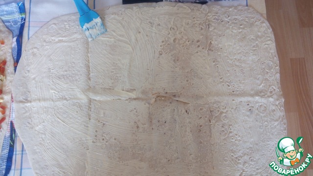 Второй лист лаваша, так же смазываем майонезом. После этого, накрываем им (стороной, которую смазали майонезом), наш первый лист, на котором находятся все ингредиенты.