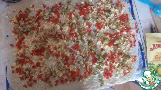 На этот лист начинаем выкладывать, равномерно, наши ингредиенты. Вначале слой из яиц, затем болгарский перец, затем соленые огурцы, лук репчатый и чеснок.