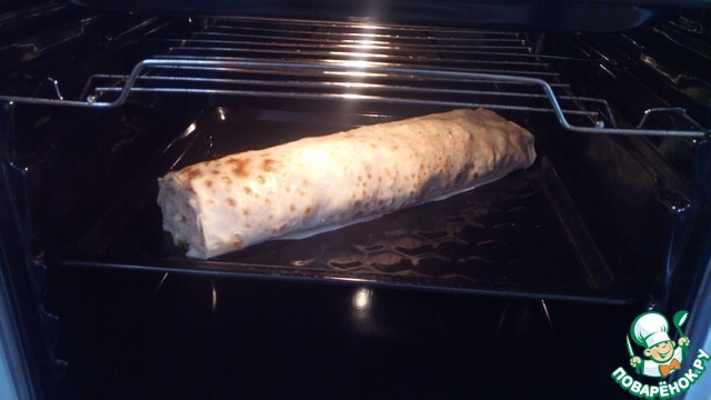 Рулет, сверху, смазываем сливочным маслом (предварительно растопленным) и отправляем в духовку на 15-20миут.