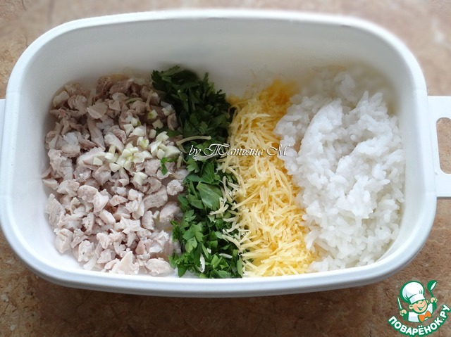 Курицу мелко порезать, добавить рубленный чеснок и зелень, сыр, рис;