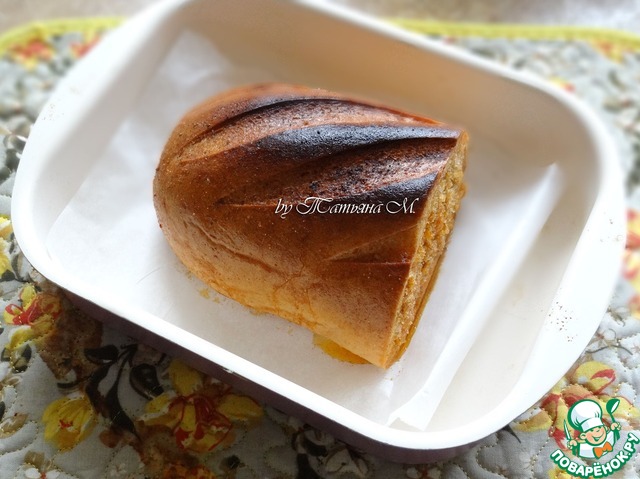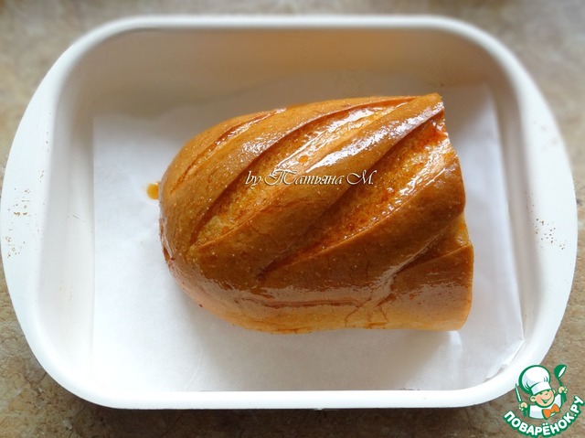 Обмазать батон со всех сторон и выложить его на пергамент в форму или на противень;