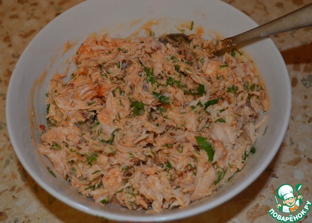 Грибы мелко режем, немного обжариваем, смешиваем с курицей и томатно-сырной массой, добавляем мелко нарезанную зелень, всю массу перемешиваем. Начинка готова.