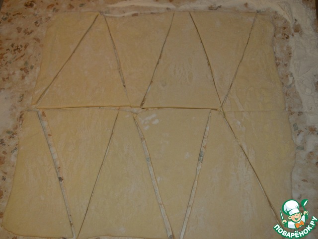Займёмся тестом. Предварительно размороженное слоёное тесто немного раскатываем и режем на треугольники, у меня был один пласт и ещё небольшой кусочек в пачке 500 грамм.