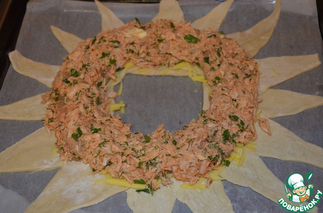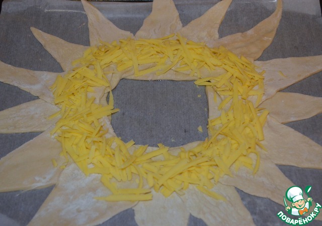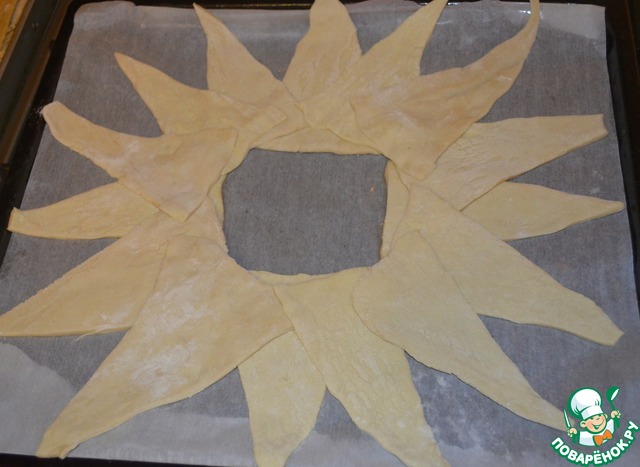 Треугольники раскладываем на смазанном противне, в виде солнечных лучиков, накладывая друг на друга