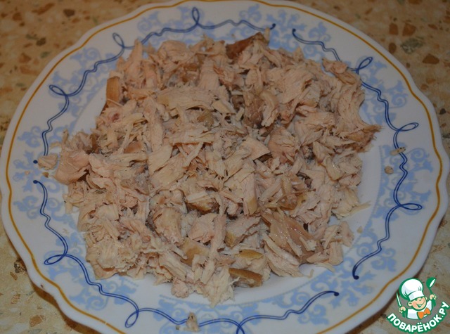 Сначала готовим начинку, куриную грудку отвариваем, в подсоленной воде, остужаем, нарезаем.