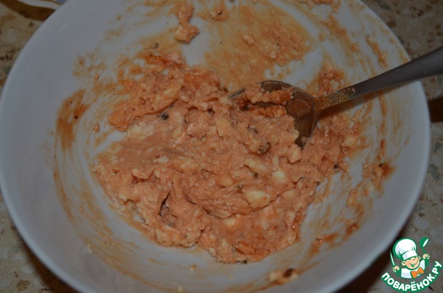 Добавляем в сыр томатный кетчуп, тщательно перемешиваем.