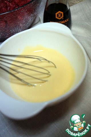 Теперь приготовим закрепитель для фарша. В небольшую миску разбиваем яйцо, вливаем сливки и 1 ст. л. соевого соуса. Перемешиваем венчиком до однородности, постепенно добавляя муку.