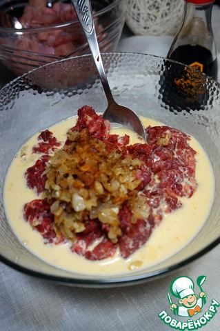 В фарш добавляем закрепитель, а также половину жаренного лука. Немного солим и перчим. Все хорошо перемешиваем.