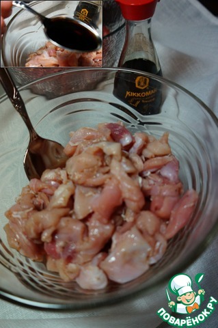 Мясо кролика необходимо сначала замариновать. Для этого нарезаем его небольшими кусочками и складываем в миску. Добавляем коньяк, 1 ст. л. соевого соуса, смесь специй, перчим и солим. Все хорошо перемешиваем. Затягиваем миску пищевой пленкой и убираем в холодильник мариноваться на 3 часа, а лучше на ночь.