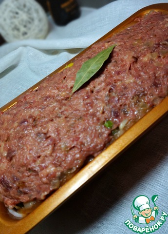 Нам понадобиться прямоугольная удлиненная форма объемом 1 литр. Форму смазываем растительным маслом и укладываем бекон немного внахлест. Бекон должен покрывать полностью дно и стенки формы. Утиный фарш и кролика выкладываем слоями. Будет три слоя фарша и два слоя кролика. Сначала идет третья чать фарша, потом половина кролика, еще третья часть фарша, оставшейся кролик. Последним слоем выкладываем оставшийся фарш и немного утрамбовываем. Сверху положим 1-2 лавровых листа.