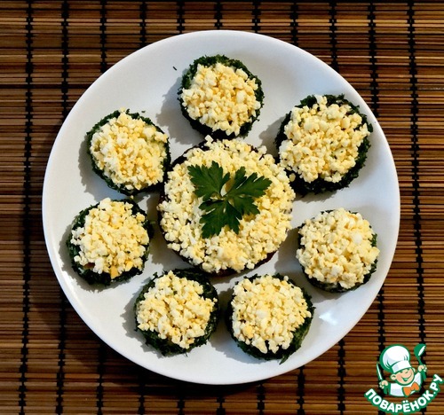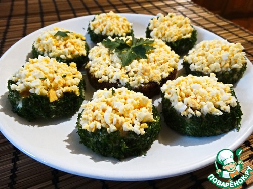 Затем обмазываем майонезом чесночную сторону и ободок. Прокатываем ободком по измельченной зелени, а верх аккуратно посыпаем яичной крошкой. Все!